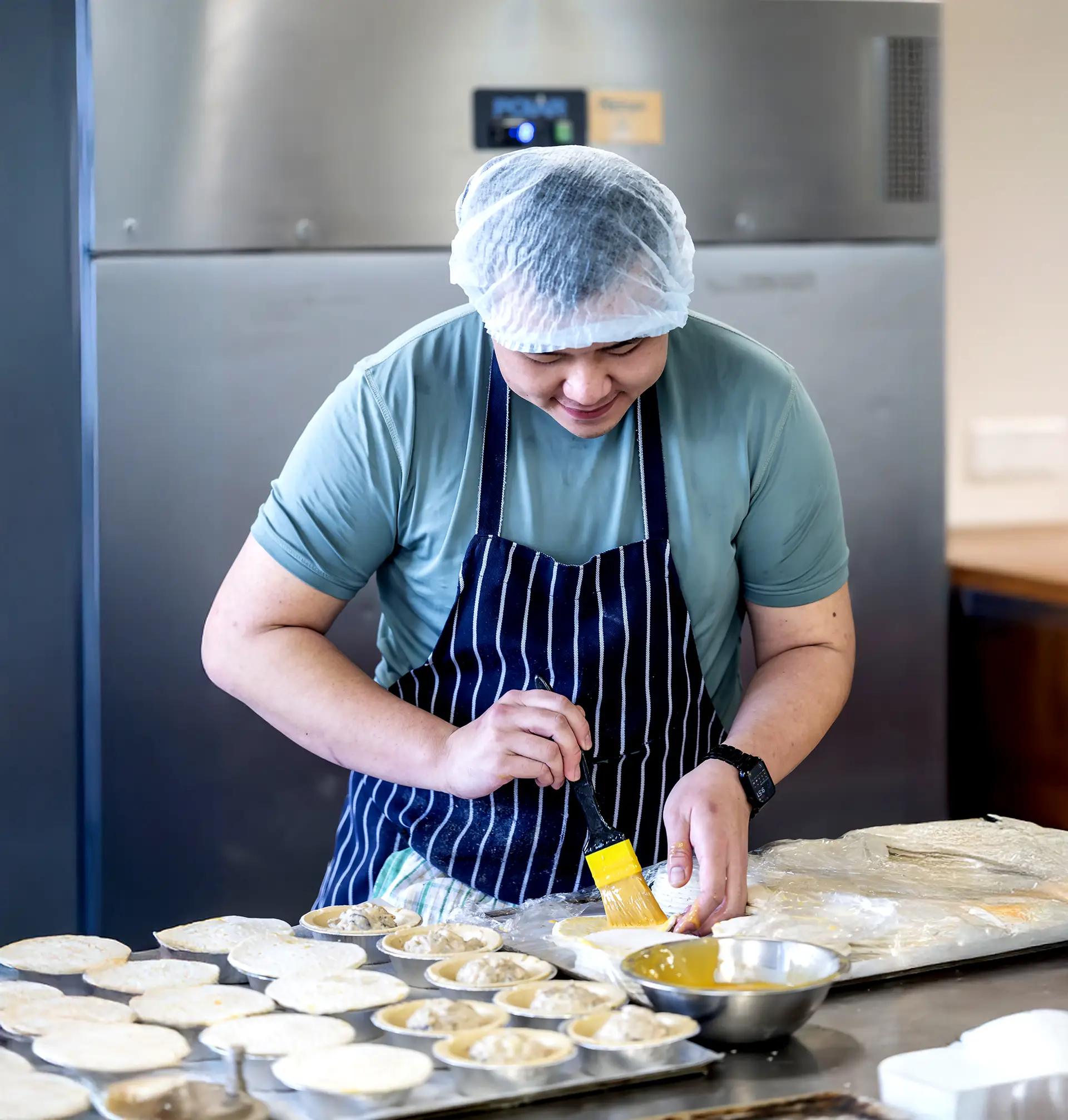 These days, Andrew is in the kitchen most of the week, arriving at 8am to check the task board before diving into a wide range of duties, from glazing pastries and filling pies to packing orders and assembling cake boxes.